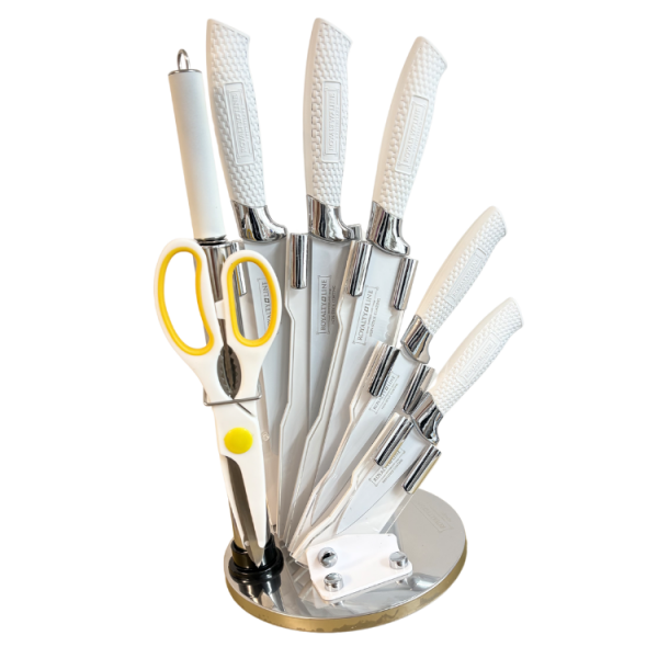 Incluye 5 tipos de cuchillos, Soporte para los cuchillos, Tijeras y Afilador.